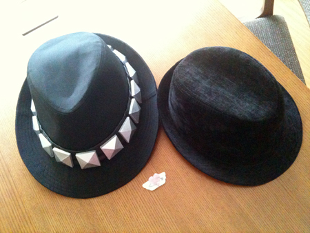 左が完成した帽子。右の一回り小さい帽子は市販されている普通の帽子サイズ。