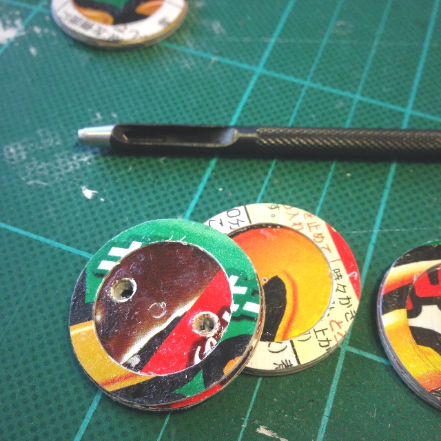 乾いたらボタンの穴を適当に開けます。100均のポンチを使ってみましたが